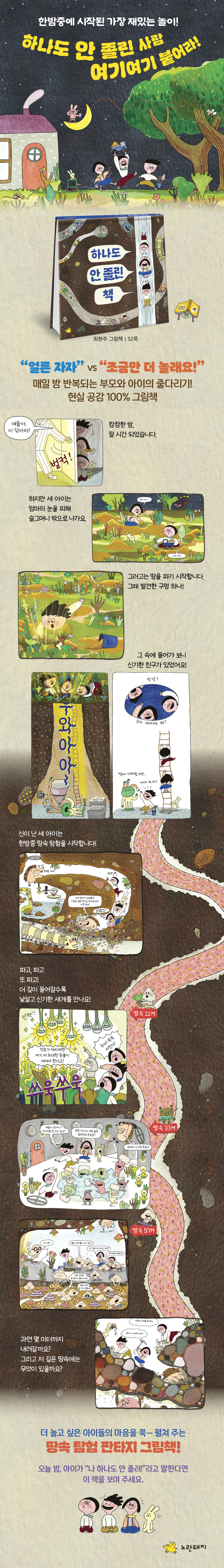 《하나도 안 졸린 책》은 마음껏 놀고 싶은 아이들의 마음을 신나게 응원하는 땅속 탐험 판타지 그림책이다.