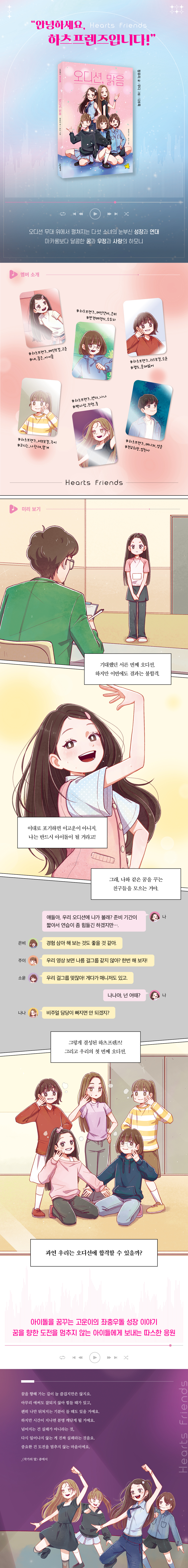 《오디션, 맑음》은 아이돌을 꿈꾸는 주인공 고운이가 친구들과 팀 ‘하츠프렌즈’를 결성해 오디션에 도전하는 과정을 그린 성장 동화다. 노래 부르고 춤출 때 가장 행복한 고운이는 아이돌의 꿈을 이루기 위해 날마다 열심히 노력한다. 합격을 기대했던 서른 번째 오디션에서 탈락한 날, 고운이는 포기 대신 함께 꿈에 도전할 친구들을 모으기로 결심한다. 그렇게 고운이와 은비, 소윤이, 주이, 나나, 그리고 매니저 성운이가 모여 하츠프렌즈를 결성하고, 오디션을 위한 연습에 돌입한다. 하지만 설렘과 기쁨도 잠시, 갑작스러운 메인 댄서 은비의 부상으로 하츠프렌즈는 위기를 맞는다. 과연 하츠프렌즈는 무사히 오디션을 치를 수 있을까? 《오디션, 맑음》은 크고 작은 어려움에도 도전을 멈추지 않고 나아가는 하츠프렌즈 멤버들의 모습을 통해, 꿈꾸는 아이들에게 따스한 응원을 보낸다.